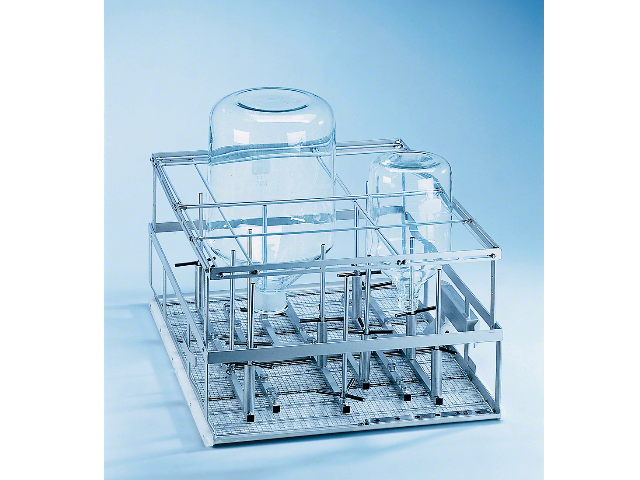 Тележка для оптимальной загрузки до 12 шт. стеклянной лабораторной посуды большого объема.