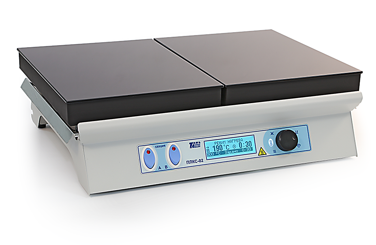 Плита ПЛКС-02 имеет графический дисплей, на котором отображаются текущая и заданная температура нагревательных поверхностей, а также заданное время и время до окончания нагрева.