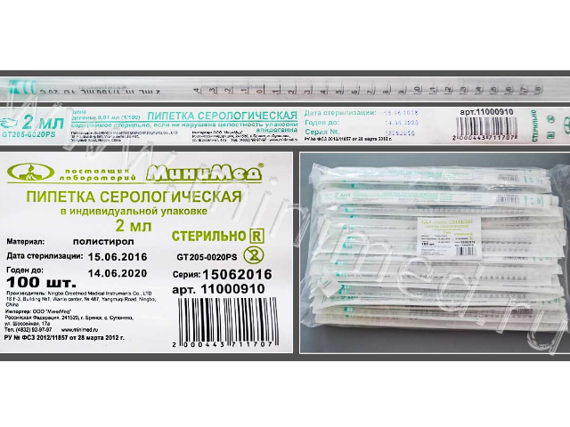 Пипетки серологические, одноразовые, изготовлены из кристаллического полистирола. Стерилизованы гамма-излучением. Цветовая маркировка кодирует соответствующий номинал согласно международным стандартам.  Пипетки апирогенны, не обладают гемолитическим и цитоксическими действиями. Градуировка на пипетки нанесена черной, устойчивой к стиранию краской.