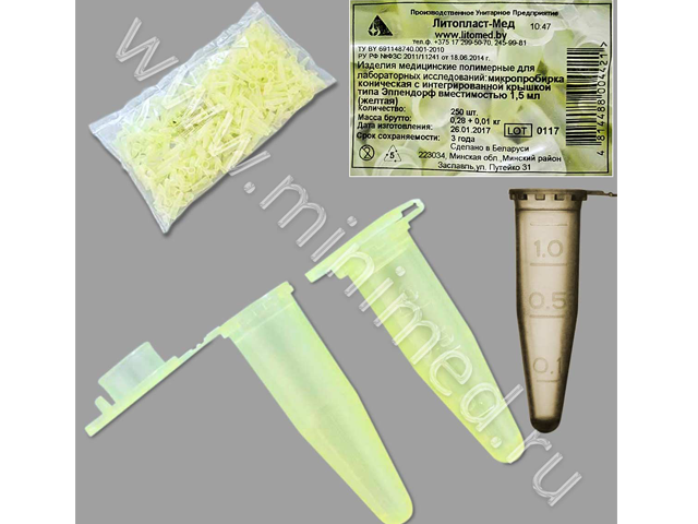 Микропробирка коническая с интегрированной крышкой типа Эппендорф 1,5мл желтая, п/п, уп.250шт