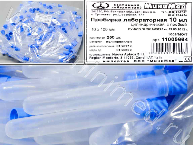 Пробирка предназначена для центрифугирования биологических и иных жидкостей. Изготовлена из полипропилена. Снабжена голубой пробкой, Имеет круговую градуировку на 1,0-2,5-5,0-10,0 мл. Нестерильная. Относительная центробежная сила, действующая на пробирку, не должна превышать 10000 g.