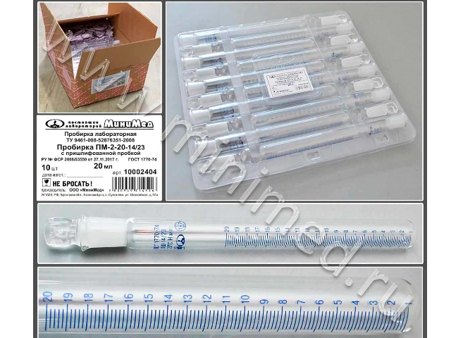 Пробирка лабораторная по ТУ 9461-008-52876351-2008, ПМ2-20-14/23, мерная со шлифом, с притертой пробкой, ГОСТ-1770-74,уп. 10 шт