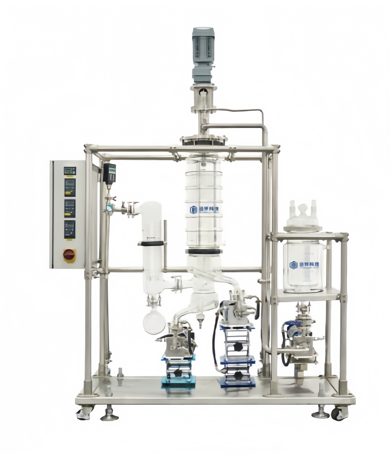 Основные компоненты системы тонкопленочного испаре- ния изготовлены из боросиликатного стекла 3.3, а испари- тель выполнен из спеченного стекла. Конструкция систе- мы обеспечивает простоту очистки без труднодоступных зон, а также минимизирует количество соединений, что га- рантирует высокий вакуум. Материалы подвергаются пол- ной дистилляции от загрузки в систему до сбора продукта. Процесс является наглядным и визуально контролируе- мым, а параметры могут оперативно корректироваться в соответствии с наблюдаемыми явлениями, что позво- ляет быстро определить оптимальные технологические условия. Боросиликатное стекло также обладает высокой коррозионной стойкостью, что делает его идеальным вы- бором для научно-исследовательских работ или мелкосерийного производства.